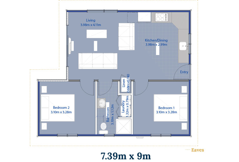 From $239,750 incl. GST, The Oxford is the most compact Clever Living home, designed for efficient living without sacrificing comfort. This two-bedroom layout includes an open-plan kitchen and living area and is suited for small sections or secondary dwellings.